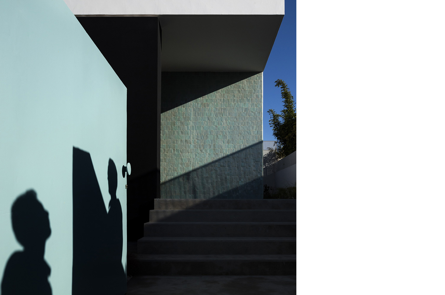 Une entrée en chicane, soulignée par un jeu de murs noir et en zellige gris-bleu accentue cette dualité et renforce l'effet de contraste entre l'intimité et la discrétion sur la rue et l'ouverture et la transparence sur la piscine et le jardin. Ce principe est décliné à travers les 3 séquences végétales, le jardin minéral à l'entrée, la séquence aquatique sur le côté latéral et le jardin végétal au sud.