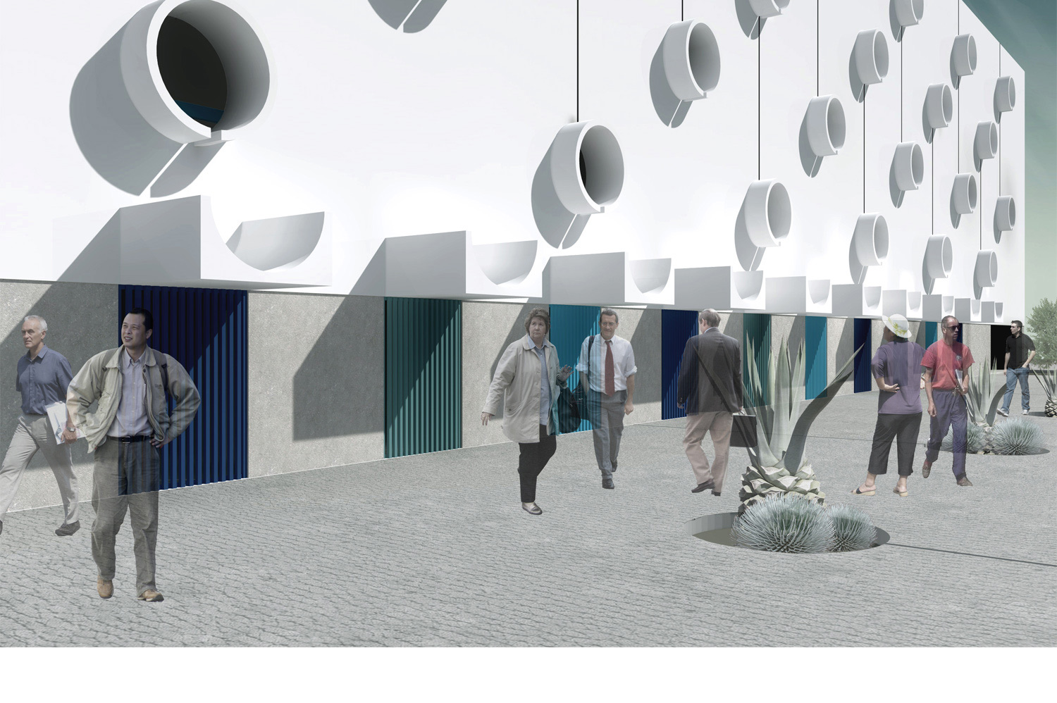 Projet de parking en R+4 de 189 places, rampe latérale à double sens. Les façades sont traitées en deux variantes, l'une avec des hublots à casquette, placés en quinconces, l'autre avec dallettes protectrices placées en décalage et jouant de différentes teintes de bleu. Les circulations verticales sont implantées dans un appendice courbe à l'extrémité du volume. Le projet intègre des commerces en rez de chaussée, dans l'esprit des boutiques traditionnelles de M'diq.