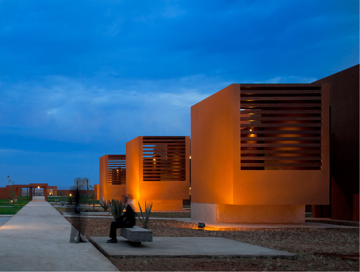 L'architecture est ainsi volontairement massive, puissante et joue du contraste entre intérieur et extérieur. Les différents bâtiments s'organisent suivant un axe nord-sud au travers d'un parcours couvert en partie, et s'articulent autour de formes en L ou de jardins intérieurs. Cette organisation permet une lisibilité et une clarté des différentes entités du projet tout en préservant un jeu d'échelles adapté à la diversité du programme. De même, une réflexion quant à la qualité thermique se traduit par un travail sur l'orientation, les protections des ouvertures et le couvert végétal, conditionnant ainsi en partie le vocabulaire et les principes architecturaux.