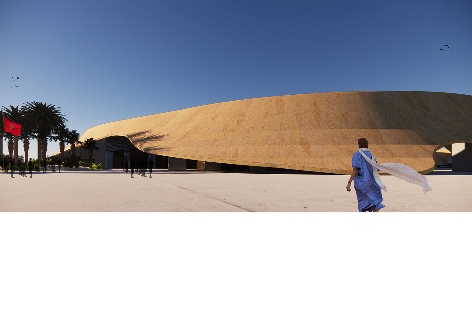 Le Stade de Dakhla émerge du paysage et s'y intègre de sorte à le recomposer, à le compléter. Le stade évoque une dune revisitée, semblant naître du sol et qui protège un déambulatoire aéré et éclairé naturellement. Ce vaste espace, situé entre la sous-face des gradins et le profil de la dune, constitue une zone intermédiaire, protégée et agréable, dans laquelle le public pourra évoluer de façon sécurisée et confortable.