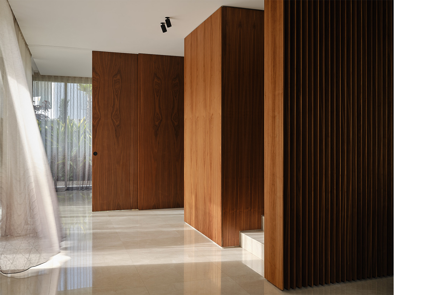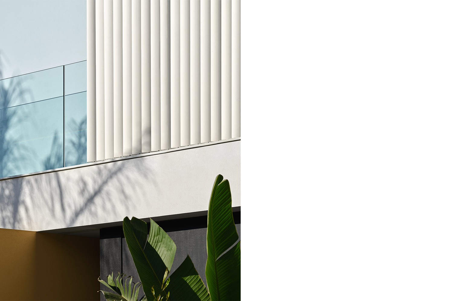 La Villa Chadi est projetée à Casablanca sur un terrain d'angle orienté nord-sud. Le plan s'organise autour d'un noyau / escalier libérant ainsi côté nord-ouest un séjour et un comptoir et côté sud une réception spacieuse, ouverte, donnant sur le jardin et la piscine. Ce volume central permet d'articuler l'ensemble des espaces en créant une distinction souple entre public et privé, espace servant et espace servi ainsi que de tracer des circulations fluides. Un ensemble de plans et de panneaux coulissants permet de réguler les vues et les transparences, l'entrée étant elle-même constituée d'une double séquence de plans coulissants, l'un opaque et sombre et l'autre en vitrage opalescent. L'espace joue ainsi de plans superposés, de séquences et de vues successives en perspective. L'ensemble est généreusement vitré sur les espaces verts et est ponctué de mur habillés de couleur sombre. Les lignes horizontales sont tendues et blanches et s'inscrivent dans la tradition casablancaise. Une palette de matériaux vient compléter la composition : bleu pâle, ocre et lamelles argentées, créant un ainsi un ensemble quasi-pictural avec le bleu du ciel et le vert de la végétation.