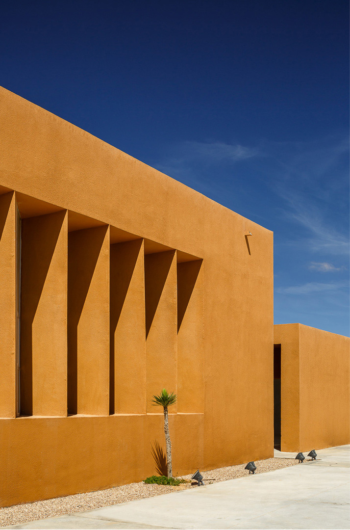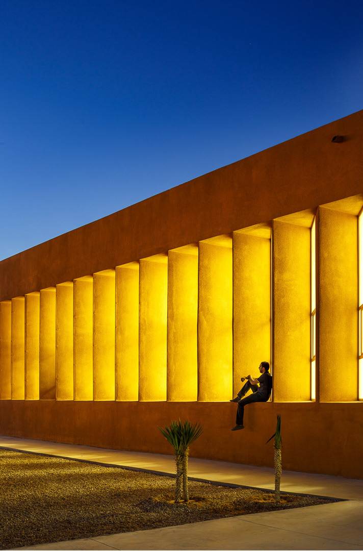 Les différents bâtiments sont fragmentés afin de permettre un maximum d'aération et d'éclairage naturels et sont reliés par un ensemble de cheminements extérieurs, placettes, places couvertes, jardins minéraux, afin de justement accentuer cette notion d'urbanité. Le langage architectural se veut massif, géométrique et joue du contraste extérieur-ocre et intérieur-lumière. Différents dispositifs de protections solaires sont utilisés : brise-soleil, double peau, couvertures etc. Les matériaux utilisés sont réduits au maximum afin d'accentuer l'abstraction et la cohérence de l'ensemble tout en répondant aux contraintes de pérennité et d'entretien.
